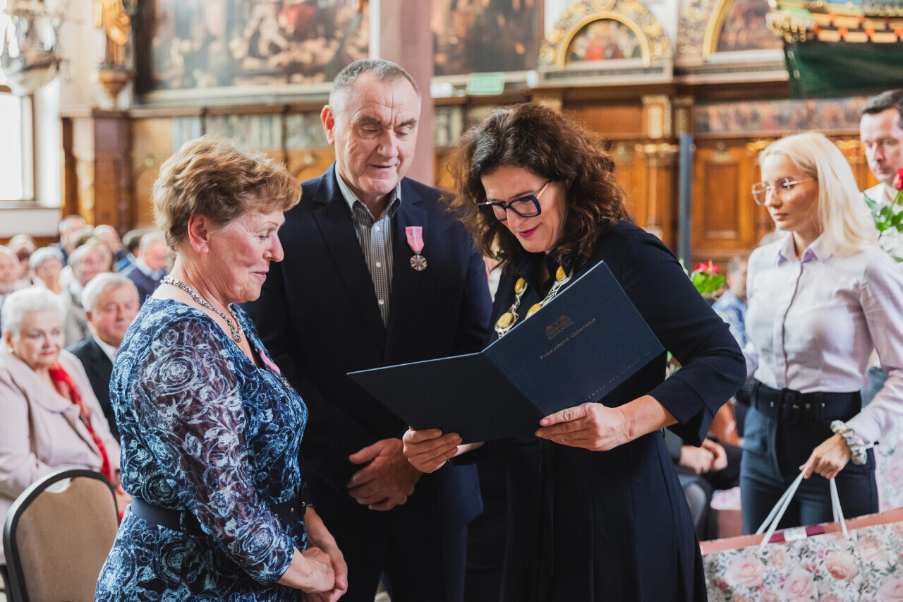 Gdańsk. Dwór Artusa. Jubileusz Par Małżeńskich - Złote Gody, podczas których Prezydent Gdańska Aleksandra Dulkiewicz wręczyła medale za długoletnie pożycie małżeńskie.