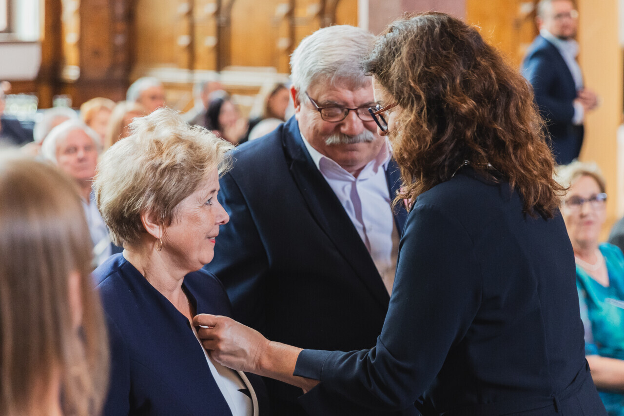 Gdańsk. Dwór Artusa. Jubileusz Par Małżeńskich - Złote Gody, podczas których Prezydent Gdańska Aleksandra Dulkiewicz wręczyła medale za długoletnie pożycie małżeńskie.