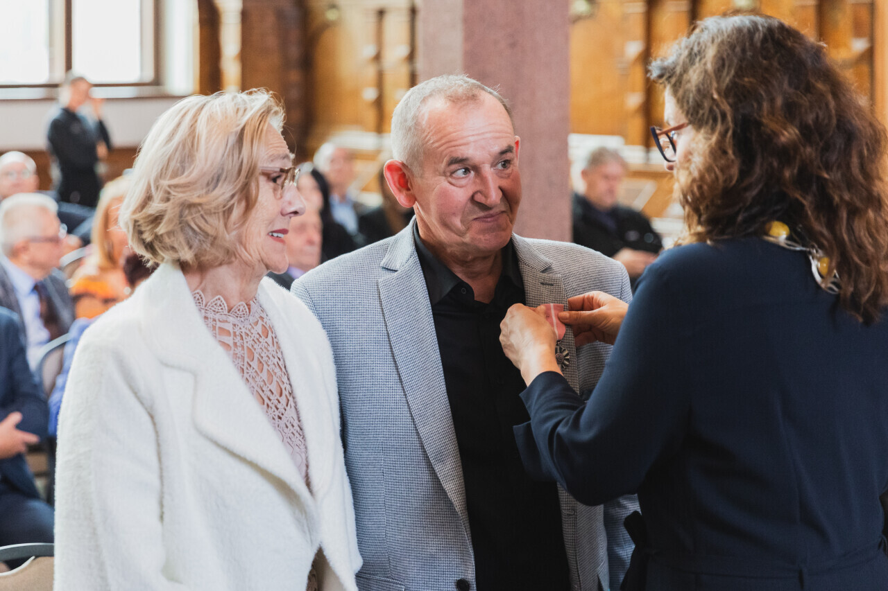 Gdańsk. Dwór Artusa. Jubileusz Par Małżeńskich - Złote Gody, podczas których Prezydent Gdańska Aleksandra Dulkiewicz wręczyła medale za długoletnie pożycie małżeńskie.