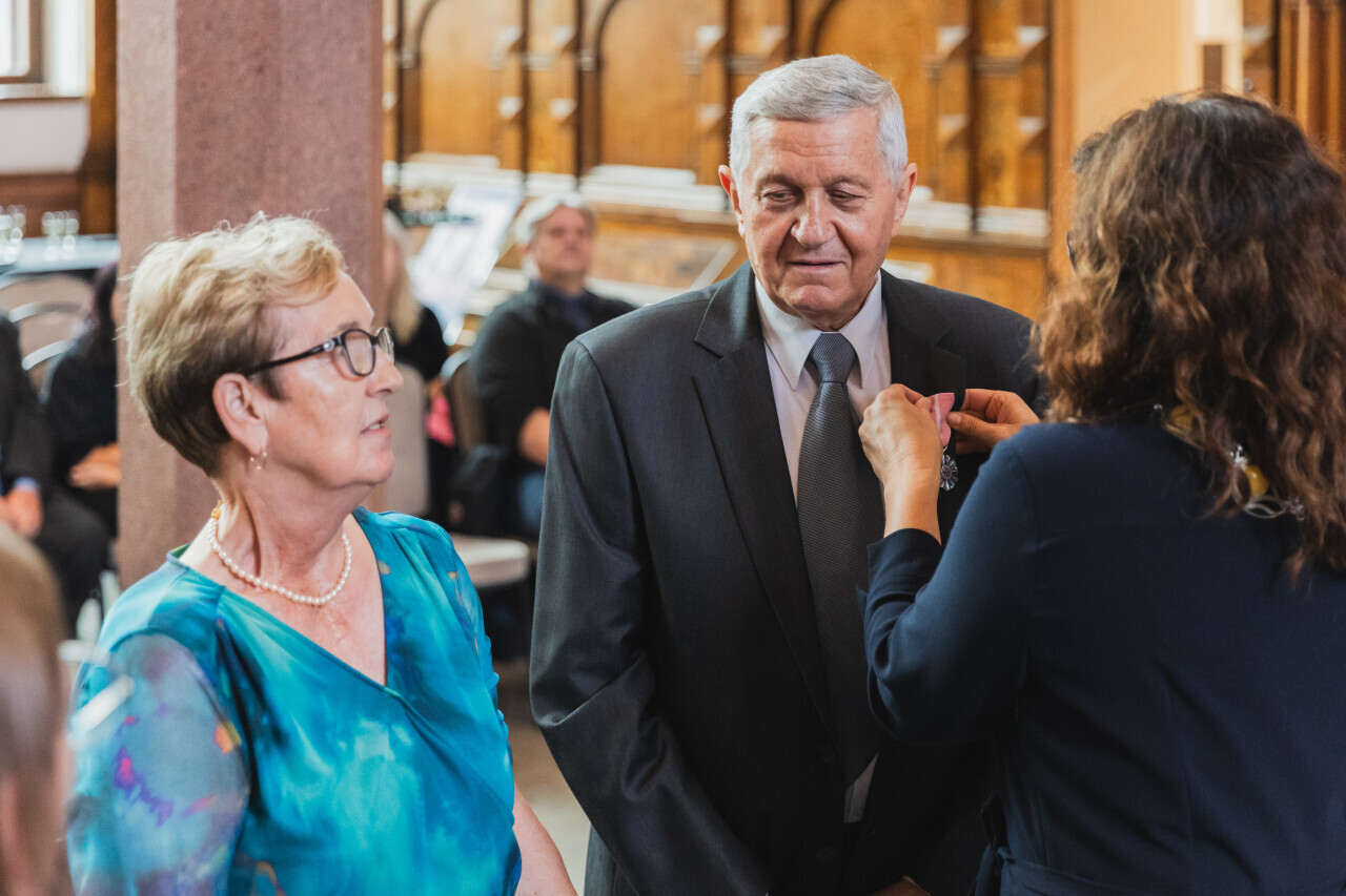 Gdańsk. Dwór Artusa. Jubileusz Par Małżeńskich - Złote Gody, podczas których Prezydent Gdańska Aleksandra Dulkiewicz wręczyła medale za długoletnie pożycie małżeńskie.