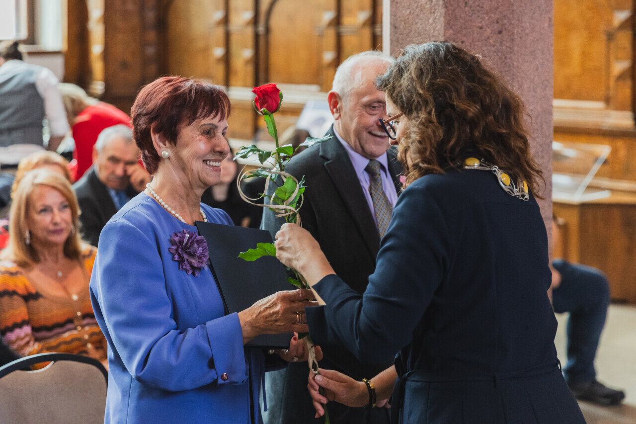 Gdańsk. Dwór Artusa. Jubileusz Par Małżeńskich - Złote Gody, podczas których Prezydent Gdańska Aleksandra Dulkiewicz wręczyła medale za długoletnie pożycie małżeńskie.