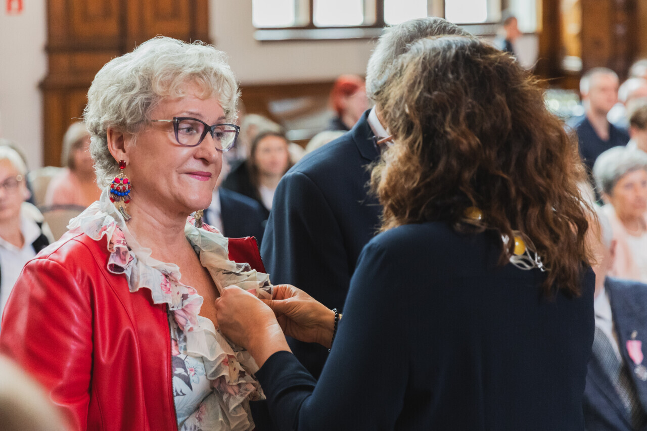 Gdańsk. Dwór Artusa. Jubileusz Par Małżeńskich - Złote Gody, podczas których Prezydent Gdańska Aleksandra Dulkiewicz wręczyła medale za długoletnie pożycie małżeńskie.