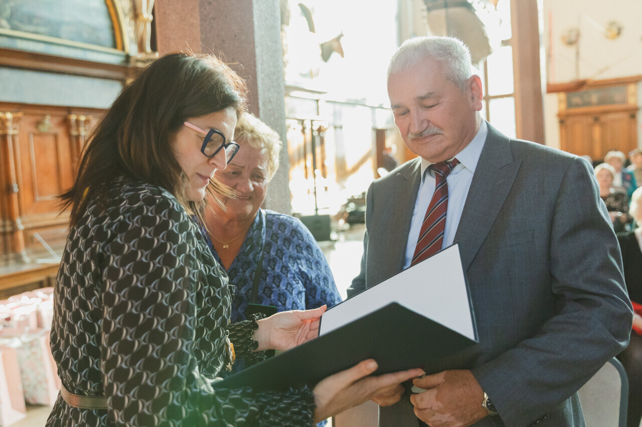Gdańsk. Dwór Artusa. Jubileusz Par Małżeńskich - Złote Gody, podczas których Prezydent Gdańska Aleksandra Dulkiewicz wręczyła medale za długoletnie pożycie małżeńskie