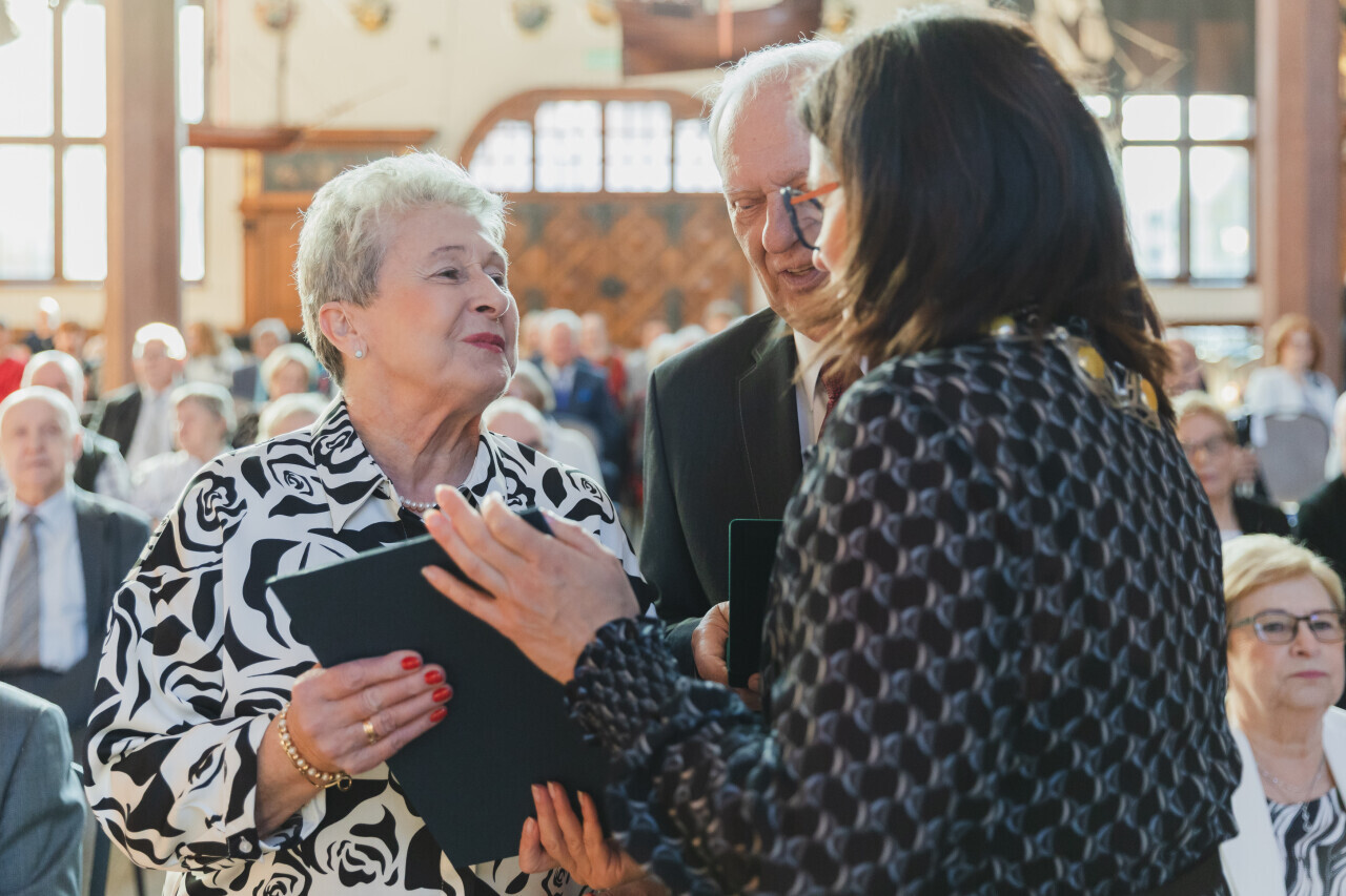 Gdańsk. Dwór Artusa. Jubileusz Par Małżeńskich - Złote Gody, podczas których Prezydent Gdańska Aleksandra Dulkiewicz wręczyła medale za długoletnie pożycie małżeńskie