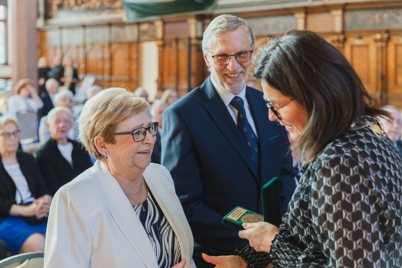 Gdańsk. Dwór Artusa. Jubileusz Par Małżeńskich - Złote Gody, podczas których Prezydent Gdańska Aleksandra Dulkiewicz wręczyła medale za długoletnie pożycie małżeńskie