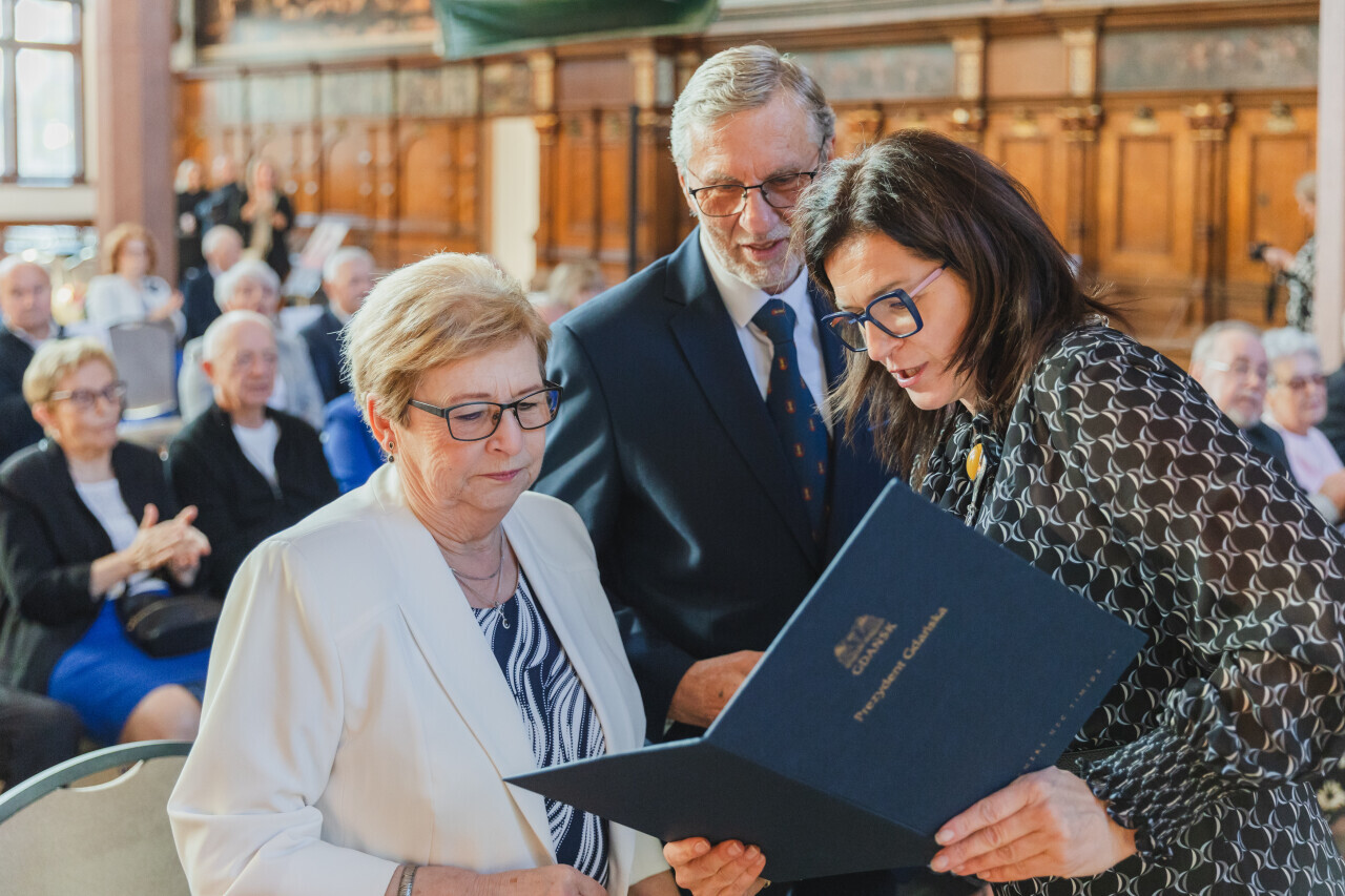 Gdańsk. Dwór Artusa. Jubileusz Par Małżeńskich - Złote Gody, podczas których Prezydent Gdańska Aleksandra Dulkiewicz wręczyła medale za długoletnie pożycie małżeńskie