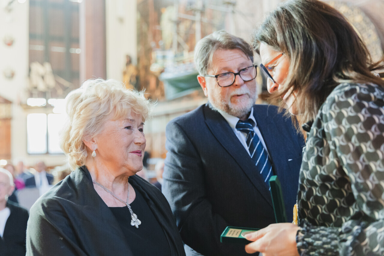 Gdańsk. Dwór Artusa. Jubileusz Par Małżeńskich - Złote Gody, podczas których Prezydent Gdańska Aleksandra Dulkiewicz wręczyła medale za długoletnie pożycie małżeńskie
