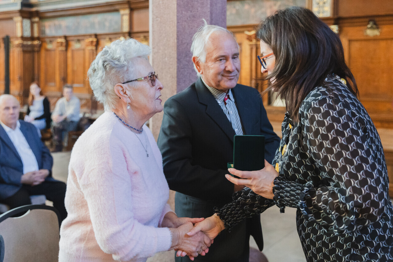 Gdańsk. Dwór Artusa. Jubileusz Par Małżeńskich - Złote Gody, podczas których Prezydent Gdańska Aleksandra Dulkiewicz wręczyła medale za długoletnie pożycie małżeńskie