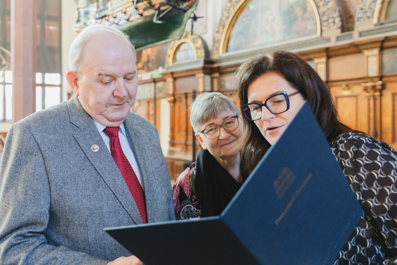 Gdańsk. Dwór Artusa. Jubileusz Par Małżeńskich - Złote Gody, podczas których Prezydent Gdańska Aleksandra Dulkiewicz wręczyła medale za długoletnie pożycie małżeńskie
