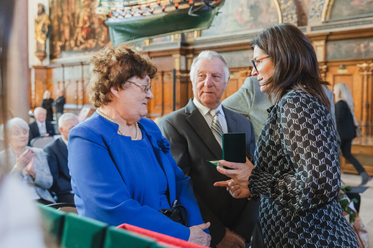 Gdańsk. Dwór Artusa. Jubileusz Par Małżeńskich - Złote Gody, podczas których Prezydent Gdańska Aleksandra Dulkiewicz wręczyła medale za długoletnie pożycie małżeńskie