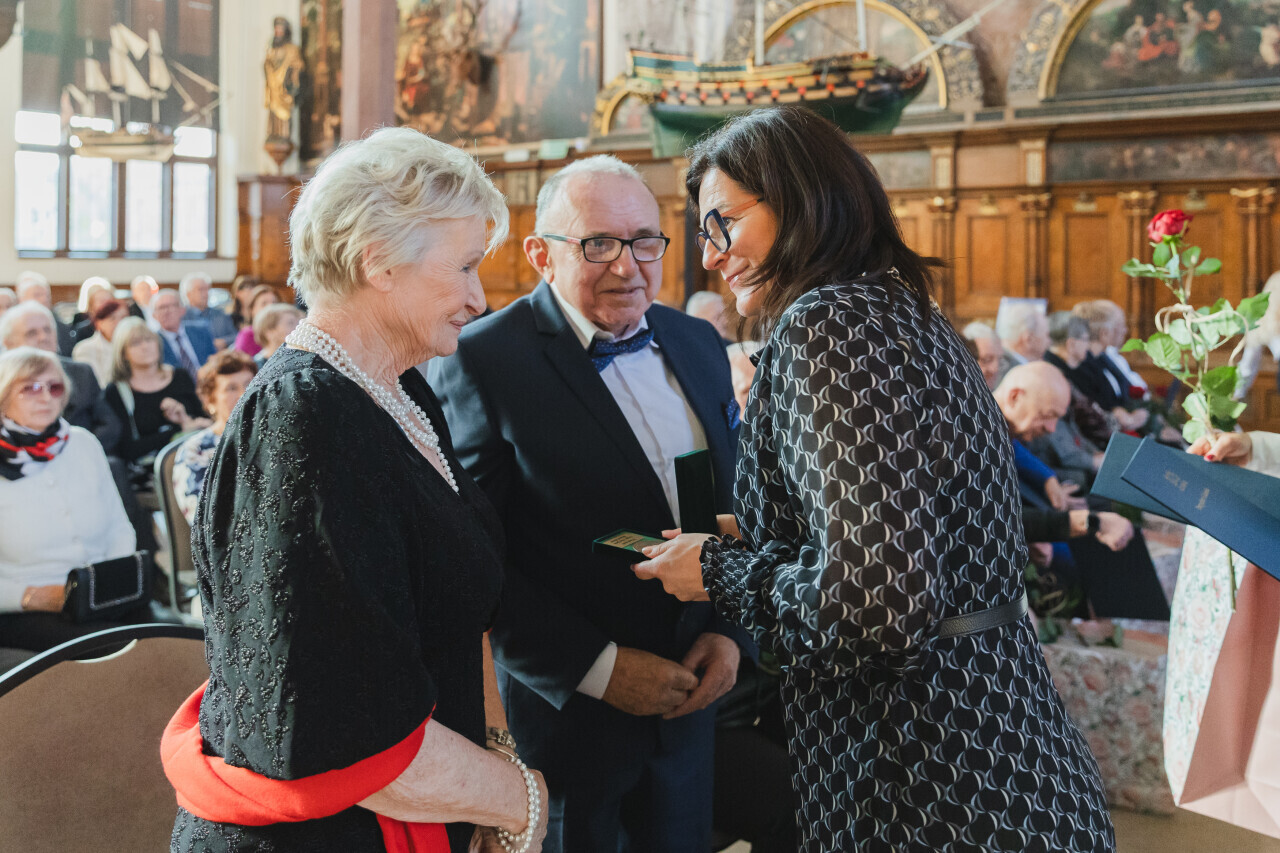 Gdańsk. Dwór Artusa. Jubileusz Par Małżeńskich - Złote Gody, podczas których Prezydent Gdańska Aleksandra Dulkiewicz wręczyła medale za długoletnie pożycie małżeńskie