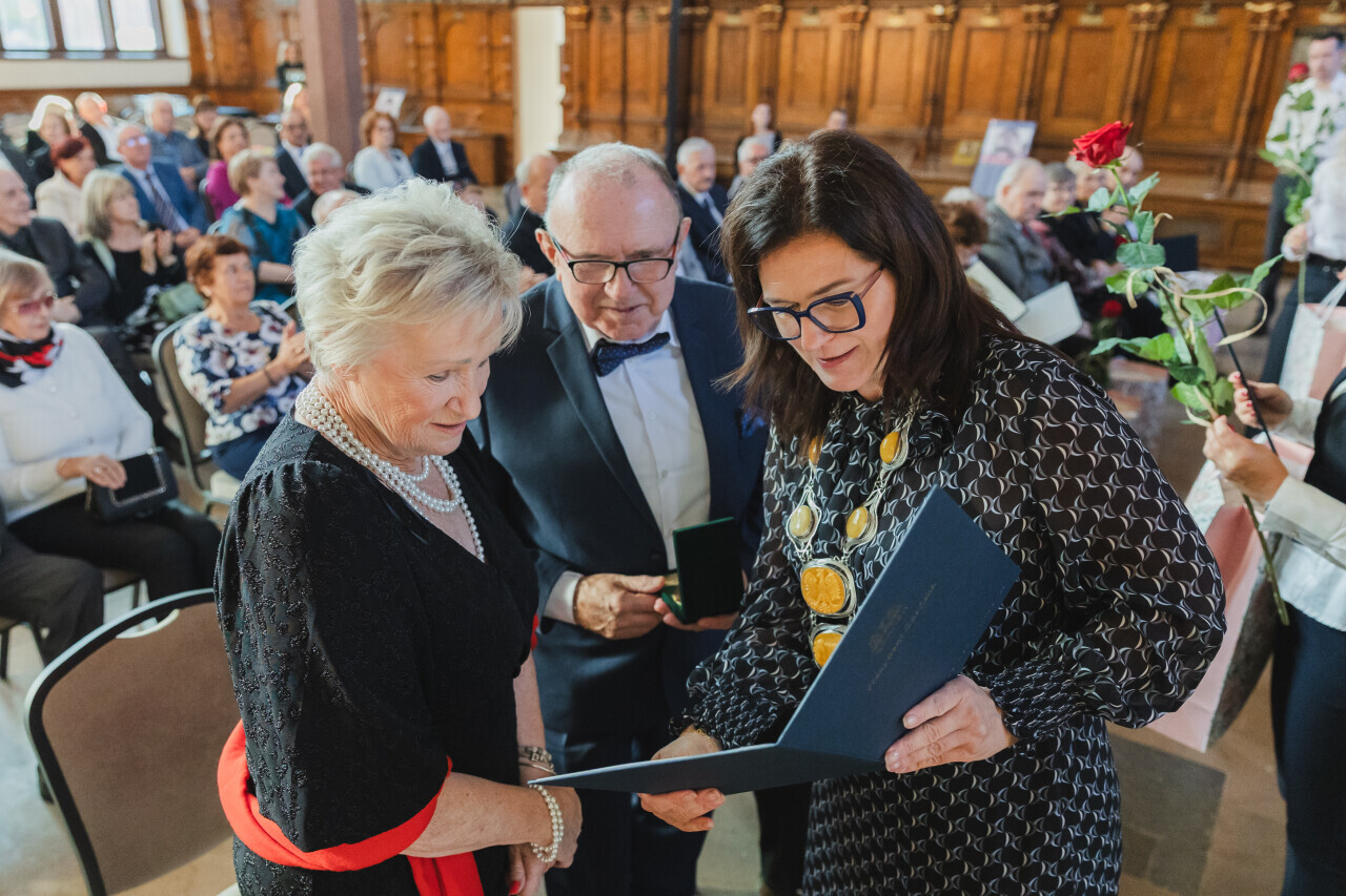 Gdańsk. Dwór Artusa. Jubileusz Par Małżeńskich - Złote Gody, podczas których Prezydent Gdańska Aleksandra Dulkiewicz wręczyła medale za długoletnie pożycie małżeńskie