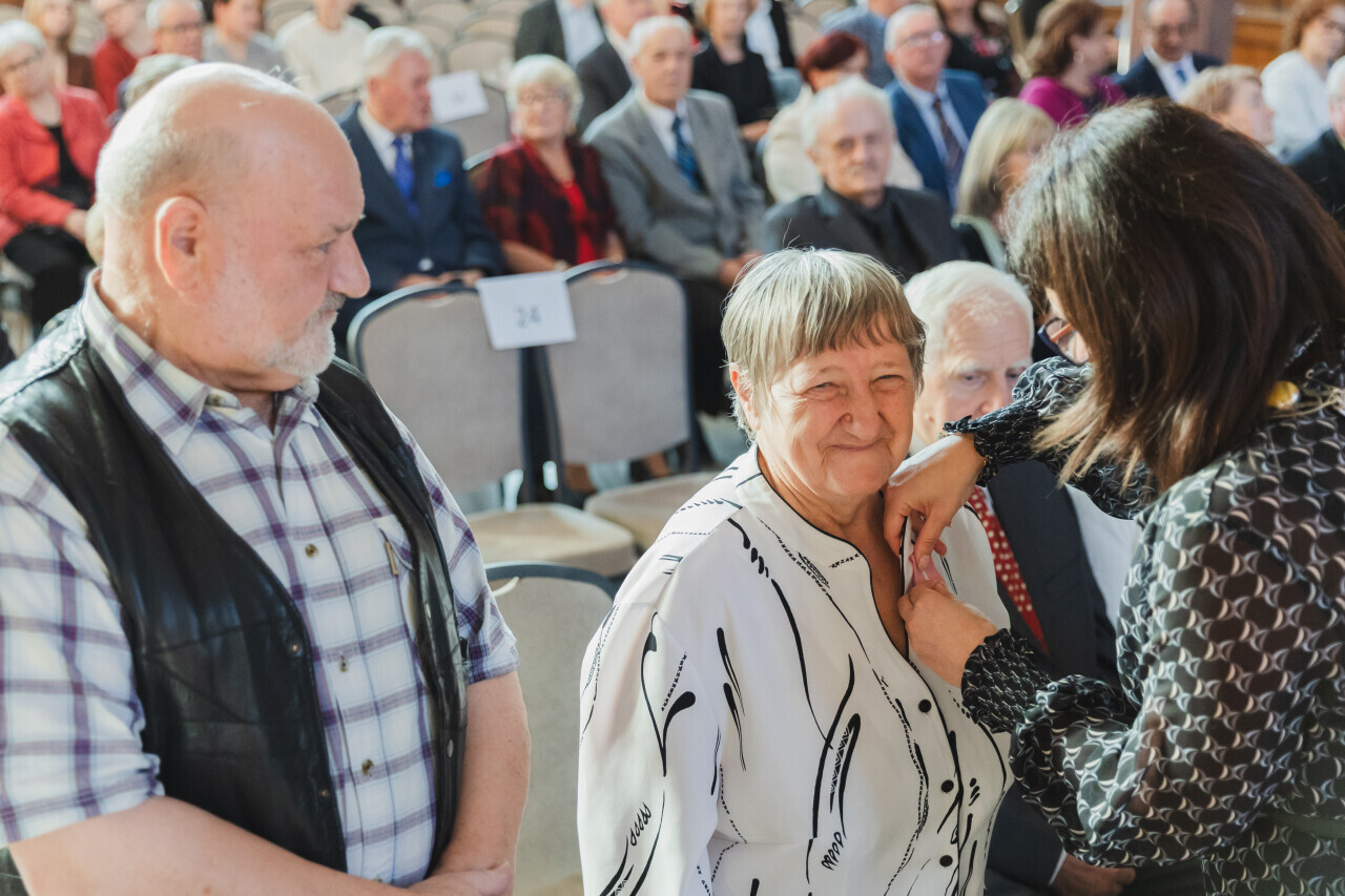 Gdańsk. Dwór Artusa. Jubileusz Par Małżeńskich - Złote Gody, podczas których Prezydent Gdańska Aleksandra Dulkiewicz wręczyła medale za długoletnie pożycie małżeńskie