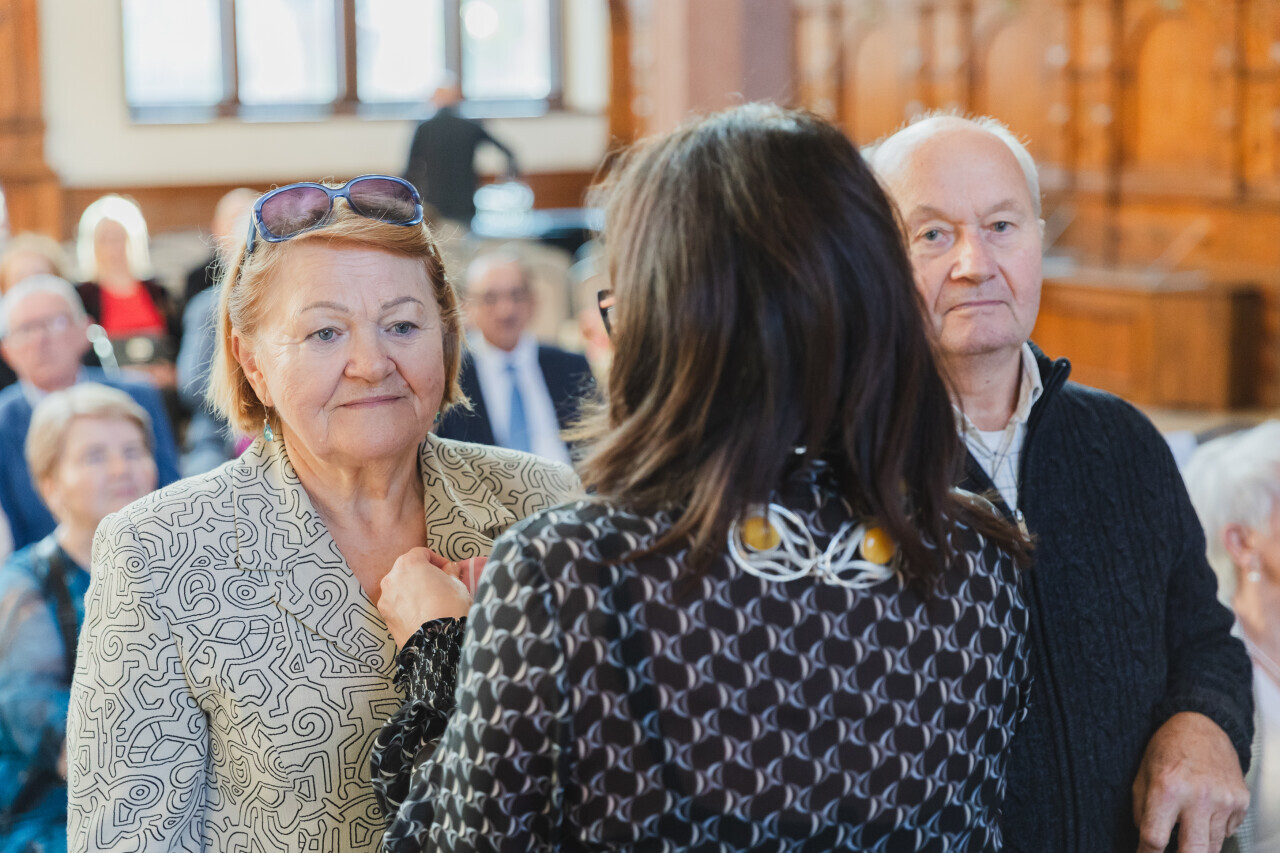 Gdańsk. Dwór Artusa. Jubileusz Par Małżeńskich - Złote Gody, podczas których Prezydent Gdańska Aleksandra Dulkiewicz wręczyła medale za długoletnie pożycie małżeńskie