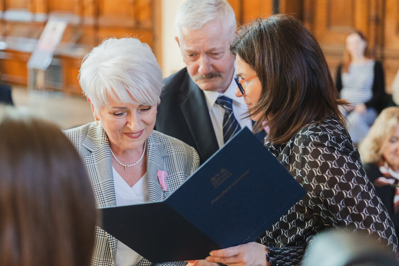 Gdańsk. Dwór Artusa. Jubileusz Par Małżeńskich - Złote Gody, podczas których Prezydent Gdańska Aleksandra Dulkiewicz wręczyła medale za długoletnie pożycie małżeńskie