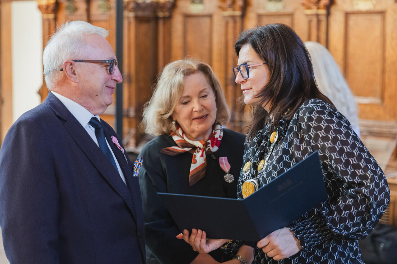 Gdańsk. Dwór Artusa. Jubileusz Par Małżeńskich - Złote Gody, podczas których Prezydent Gdańska Aleksandra Dulkiewicz wręczyła medale za długoletnie pożycie małżeńskie
