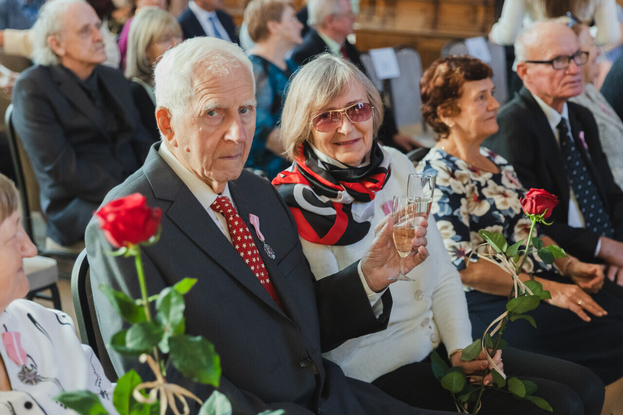 Gdańsk. Dwór Artusa. Jubileusz Par Małżeńskich - Złote Gody, podczas których Prezydent Gdańska Aleksandra Dulkiewicz wręczyła medale za długoletnie pożycie małżeńskie
