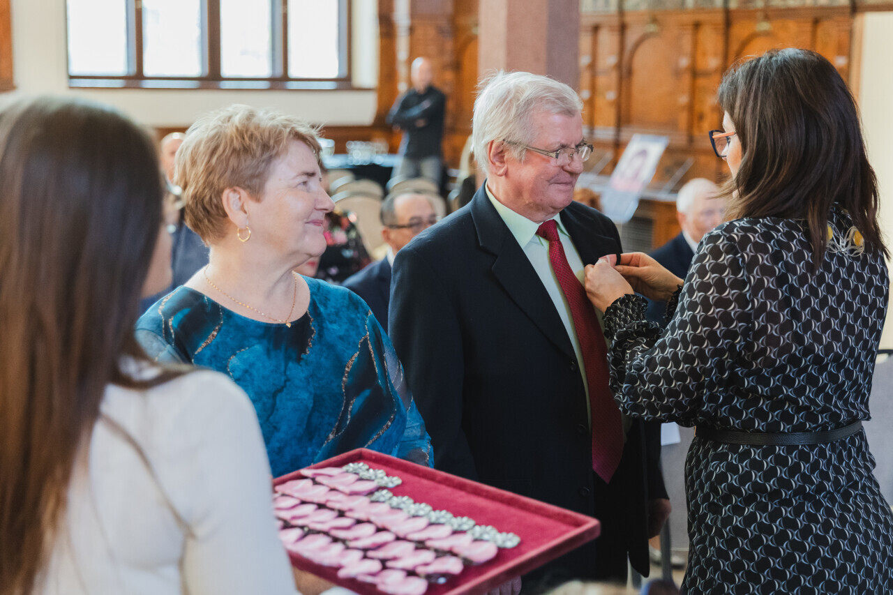 Gdańsk. Dwór Artusa. Jubileusz Par Małżeńskich - Złote Gody, podczas których Prezydent Gdańska Aleksandra Dulkiewicz wręczyła medale za długoletnie pożycie małżeńskie