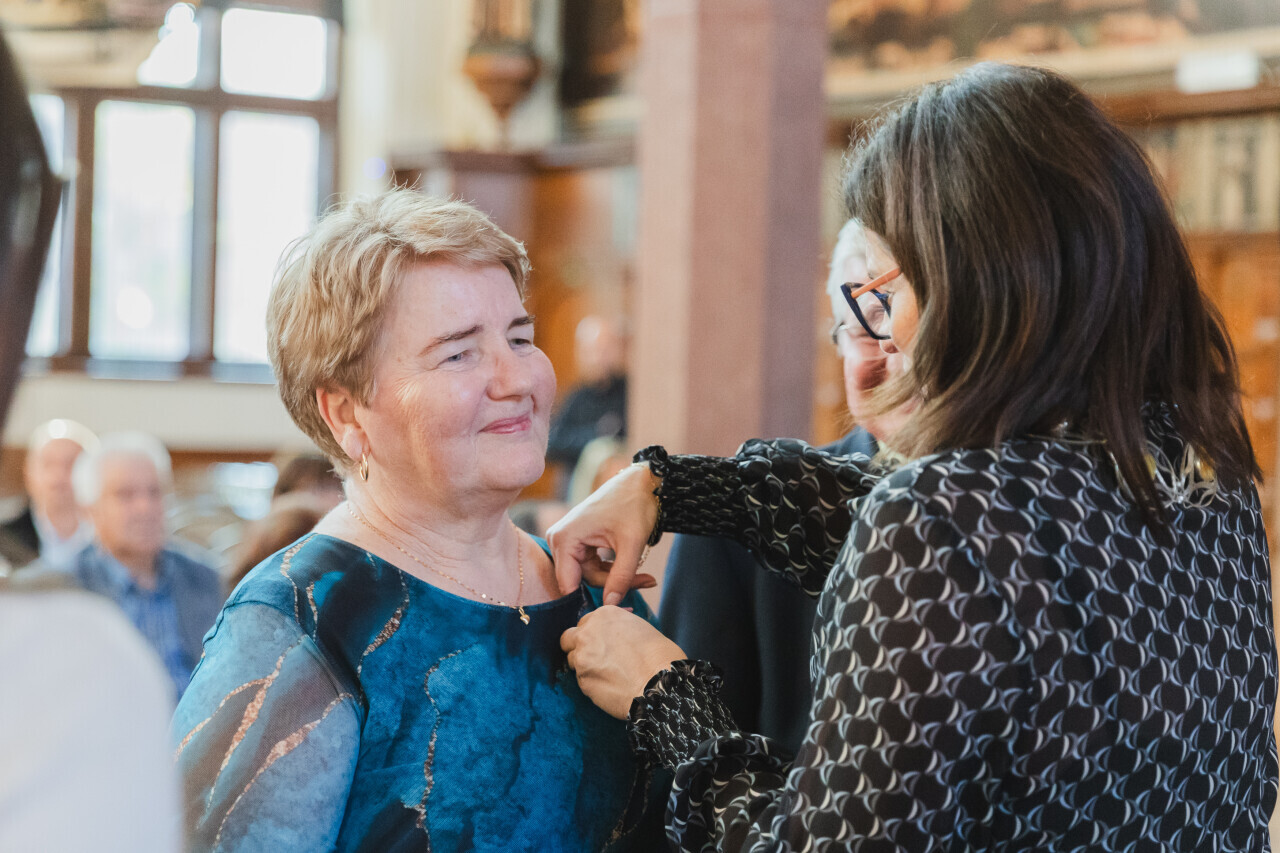 Gdańsk. Dwór Artusa. Jubileusz Par Małżeńskich - Złote Gody, podczas których Prezydent Gdańska Aleksandra Dulkiewicz wręczyła medale za długoletnie pożycie małżeńskie
