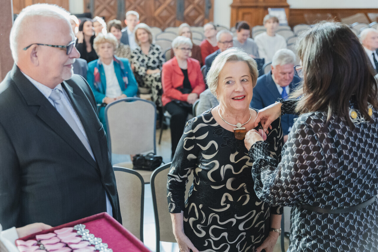 Gdańsk. Dwór Artusa. Jubileusz Par Małżeńskich - Złote Gody, podczas których Prezydent Gdańska Aleksandra Dulkiewicz wręczyła medale za długoletnie pożycie małżeńskie