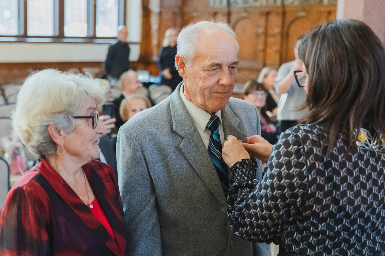 Gdańsk. Dwór Artusa. Jubileusz Par Małżeńskich - Złote Gody, podczas których Prezydent Gdańska Aleksandra Dulkiewicz wręczyła medale za długoletnie pożycie małżeńskie