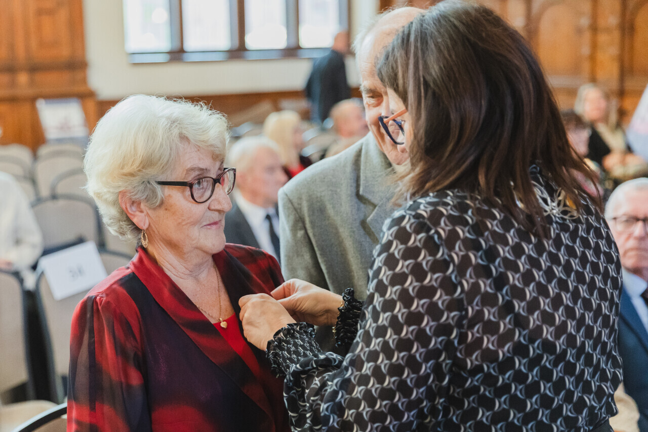 Gdańsk. Dwór Artusa. Jubileusz Par Małżeńskich - Złote Gody, podczas których Prezydent Gdańska Aleksandra Dulkiewicz wręczyła medale za długoletnie pożycie małżeńskie