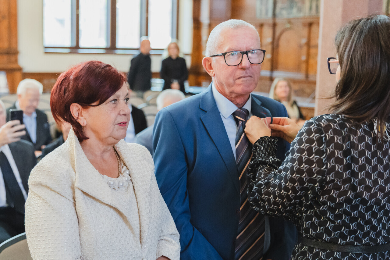 Gdańsk. Dwór Artusa. Jubileusz Par Małżeńskich - Złote Gody, podczas których Prezydent Gdańska Aleksandra Dulkiewicz wręczyła medale za długoletnie pożycie małżeńskie