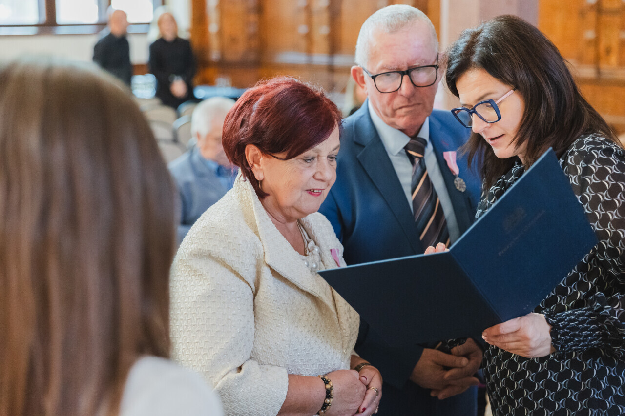 Gdańsk. Dwór Artusa. Jubileusz Par Małżeńskich - Złote Gody, podczas których Prezydent Gdańska Aleksandra Dulkiewicz wręczyła medale za długoletnie pożycie małżeńskie