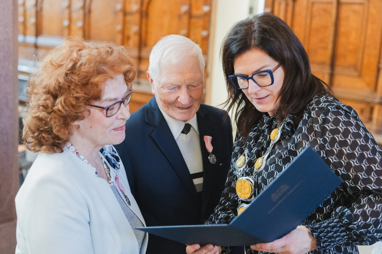 Gdańsk. Dwór Artusa. Jubileusz Par Małżeńskich - Złote Gody, podczas których Prezydent Gdańska Aleksandra Dulkiewicz wręczyła medale za długoletnie pożycie małżeńskie