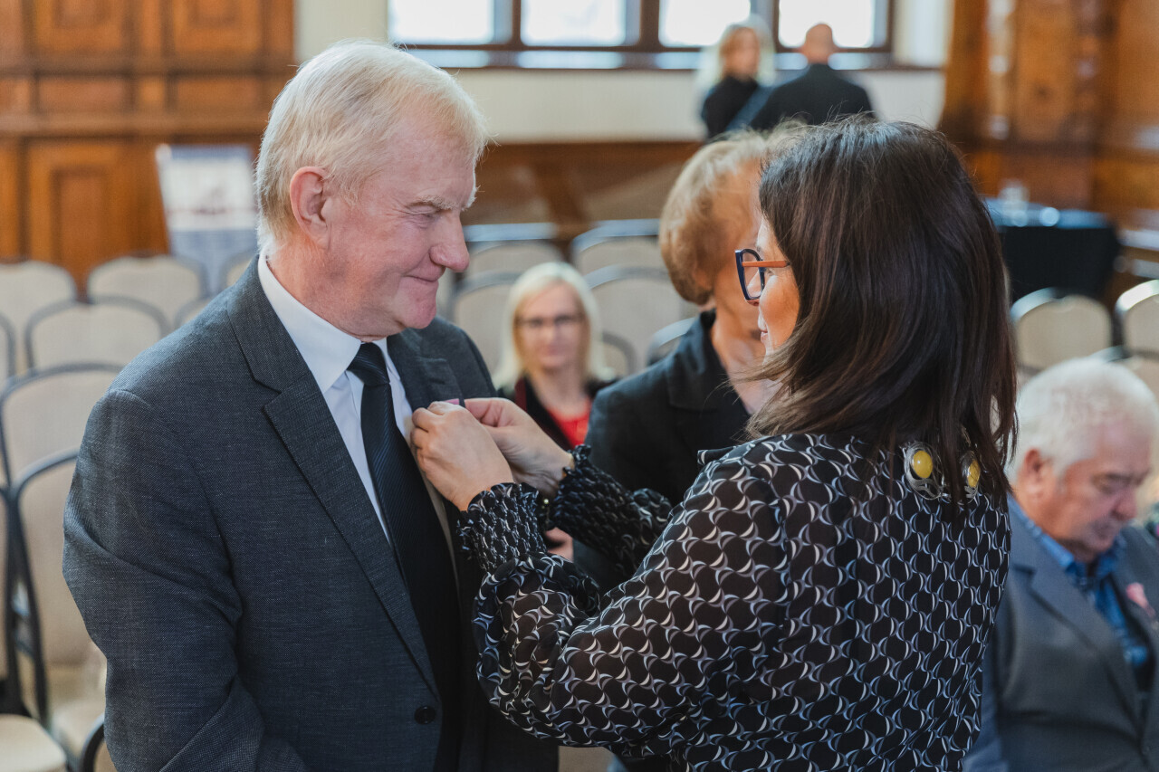 Gdańsk. Dwór Artusa. Jubileusz Par Małżeńskich - Złote Gody, podczas których Prezydent Gdańska Aleksandra Dulkiewicz wręczyła medale za długoletnie pożycie małżeńskie