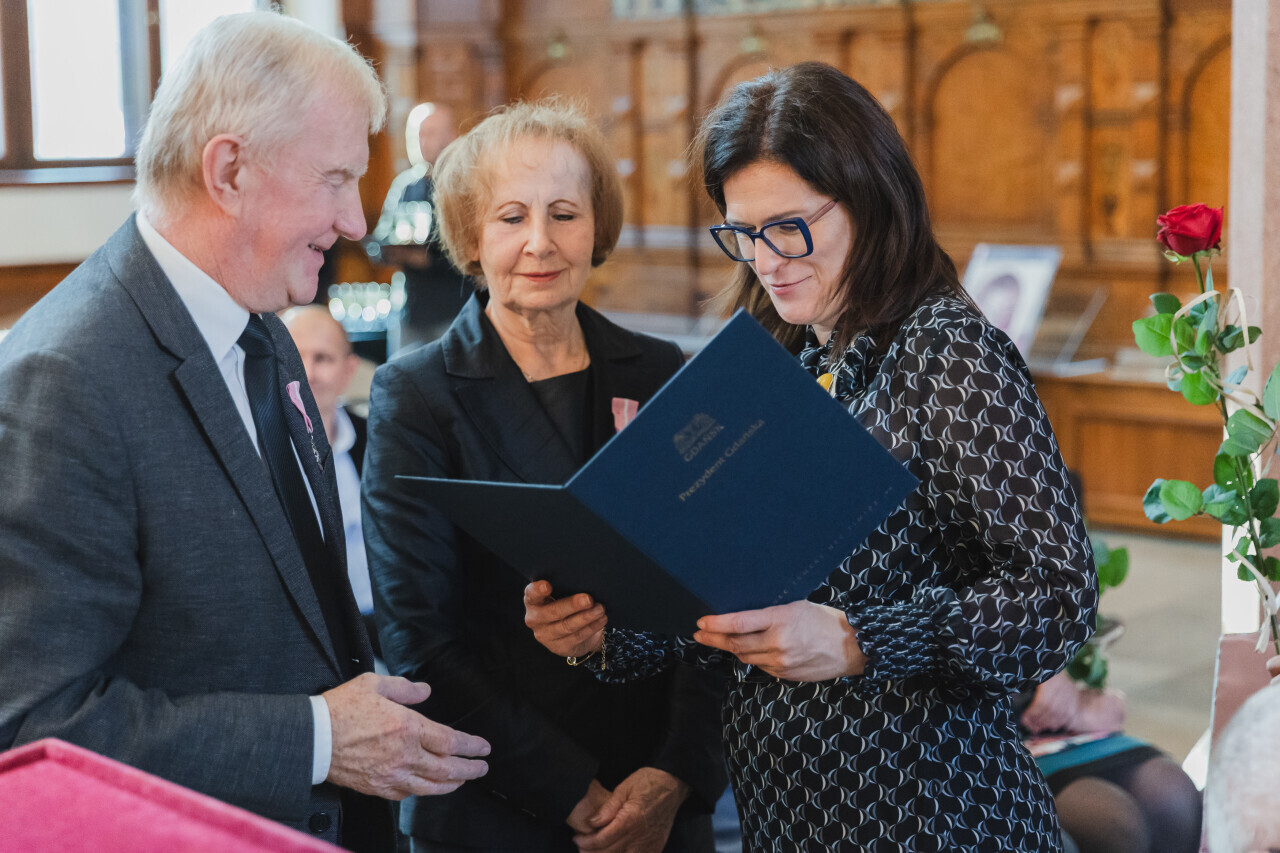 Gdańsk. Dwór Artusa. Jubileusz Par Małżeńskich - Złote Gody, podczas których Prezydent Gdańska Aleksandra Dulkiewicz wręczyła medale za długoletnie pożycie małżeńskie