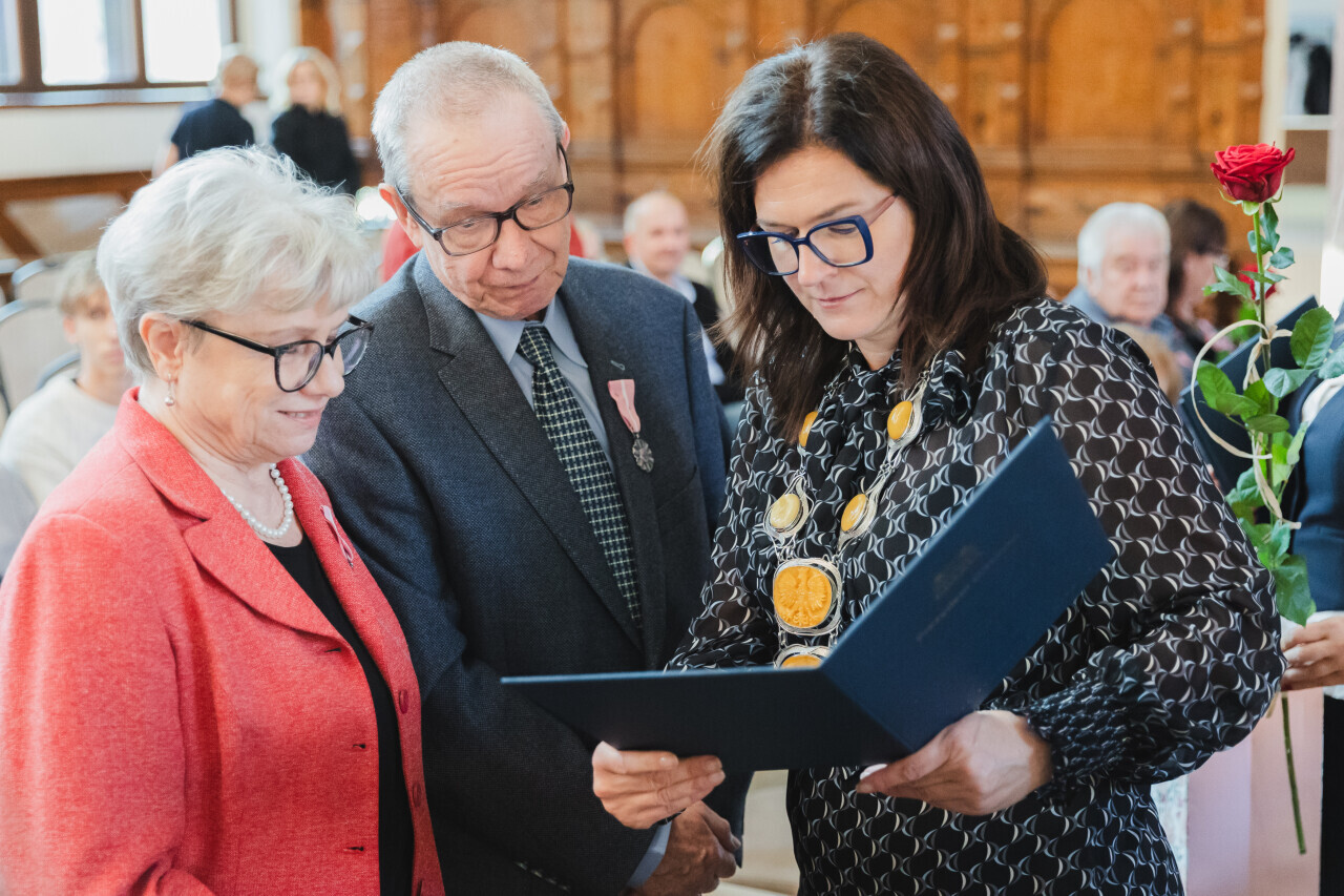 Gdańsk. Dwór Artusa. Jubileusz Par Małżeńskich - Złote Gody, podczas których Prezydent Gdańska Aleksandra Dulkiewicz wręczyła medale za długoletnie pożycie małżeńskie