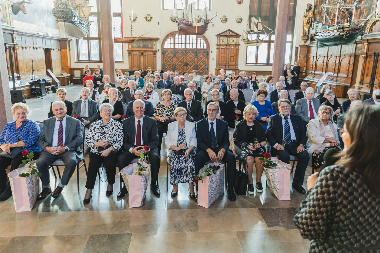 Gdańsk. Dwór Artusa. Jubileusz Par Małżeńskich - Złote Gody, podczas których Prezydent Gdańska Aleksandra Dulkiewicz wręczyła medale za długoletnie pożycie małżeńskie