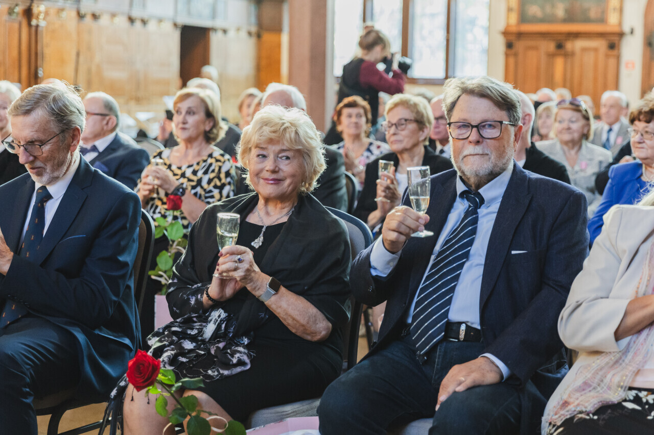 Gdańsk. Dwór Artusa. Jubileusz Par Małżeńskich - Złote Gody, podczas których Prezydent Gdańska Aleksandra Dulkiewicz wręczyła medale za długoletnie pożycie małżeńskie