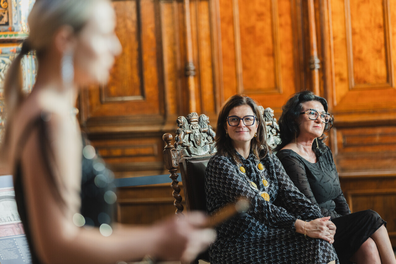 Gdańsk. Dwór Artusa. Jubileusz Par Małżeńskich - Złote Gody, podczas których Prezydent Gdańska Aleksandra Dulkiewicz wręczyła medale za długoletnie pożycie małżeńskie