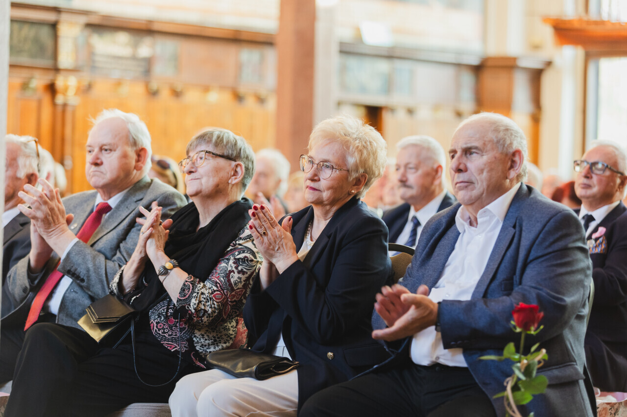 Gdańsk. Dwór Artusa. Jubileusz Par Małżeńskich - Złote Gody, podczas których Prezydent Gdańska Aleksandra Dulkiewicz wręczyła medale za długoletnie pożycie małżeńskie