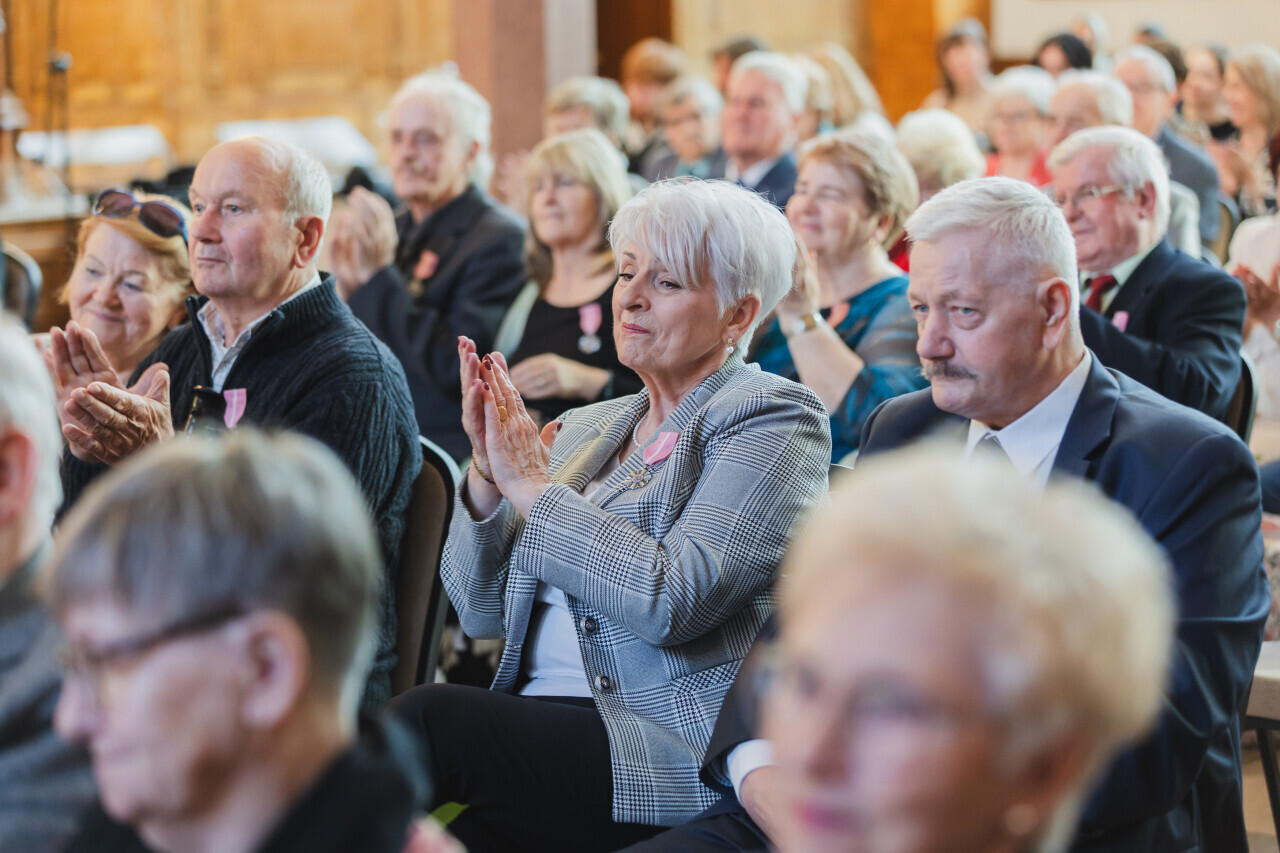 Gdańsk. Dwór Artusa. Jubileusz Par Małżeńskich - Złote Gody, podczas których Prezydent Gdańska Aleksandra Dulkiewicz wręczyła medale za długoletnie pożycie małżeńskie