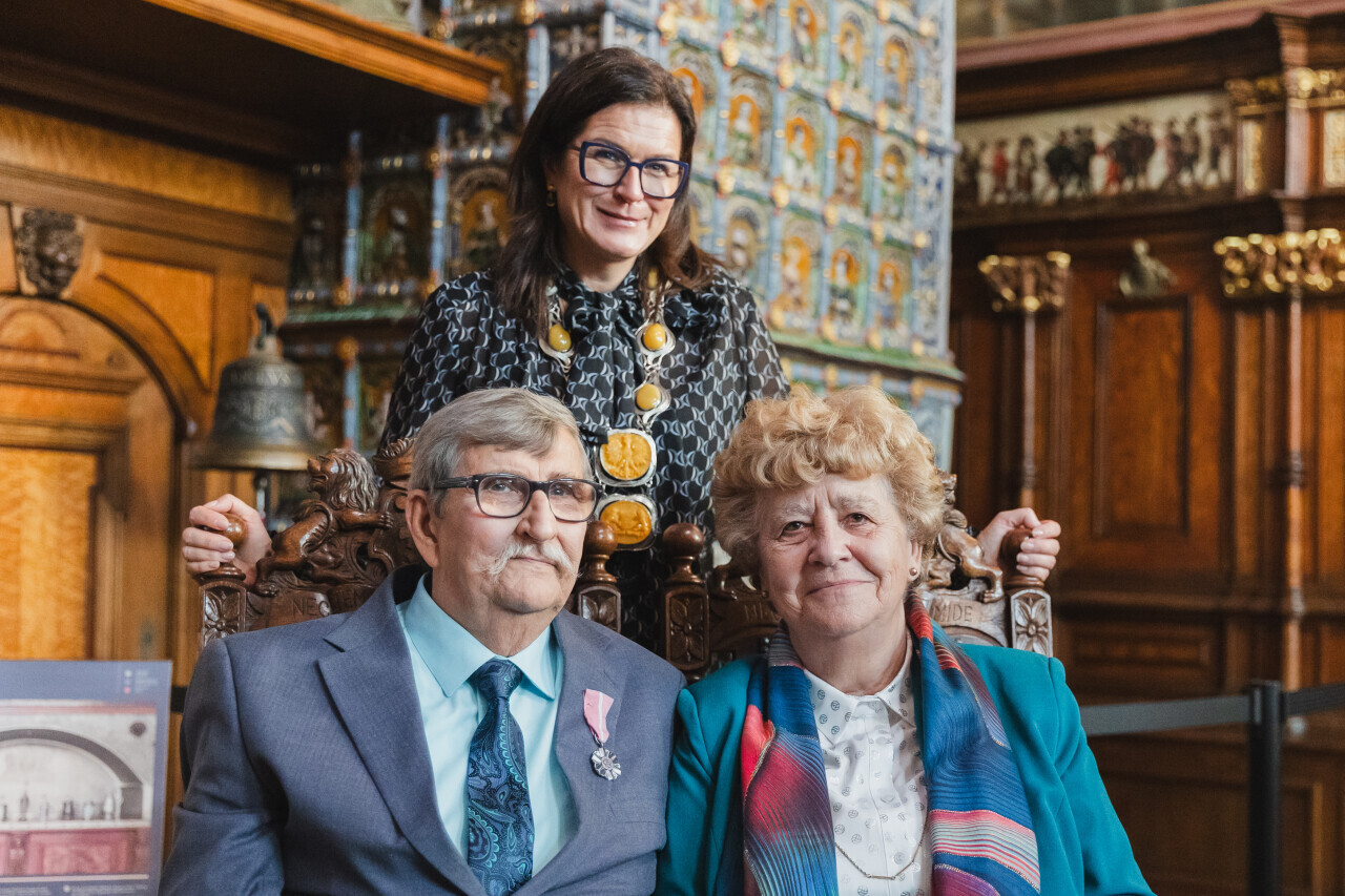 Gdańsk. Dwór Artusa. Jubileusz Par Małżeńskich - Złote Gody, podczas których Prezydent Gdańska Aleksandra Dulkiewicz wręczyła medale za długoletnie pożycie małżeńskie
