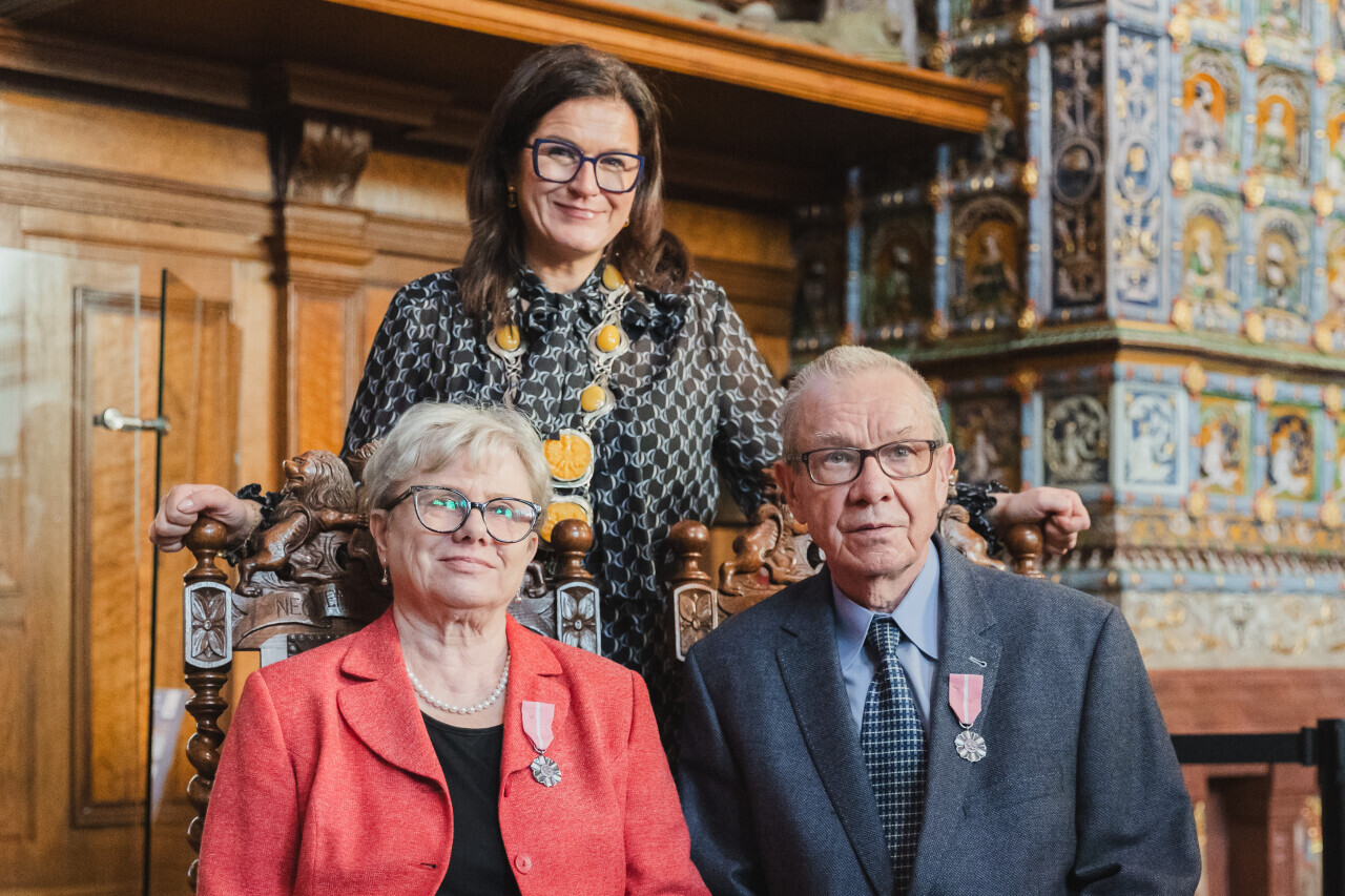 Gdańsk. Dwór Artusa. Jubileusz Par Małżeńskich - Złote Gody, podczas których Prezydent Gdańska Aleksandra Dulkiewicz wręczyła medale za długoletnie pożycie małżeńskie