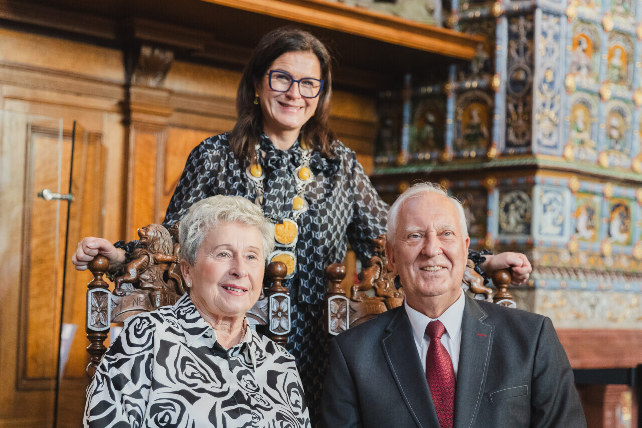 Gdańsk. Dwór Artusa. Jubileusz Par Małżeńskich - Złote Gody, podczas których Prezydent Gdańska Aleksandra Dulkiewicz wręczyła medale za długoletnie pożycie małżeńskie