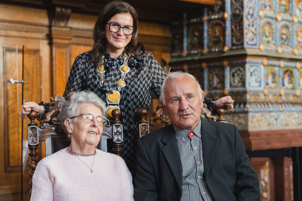Gdańsk. Dwór Artusa. Jubileusz Par Małżeńskich - Złote Gody, podczas których Prezydent Gdańska Aleksandra Dulkiewicz wręczyła medale za długoletnie pożycie małżeńskie