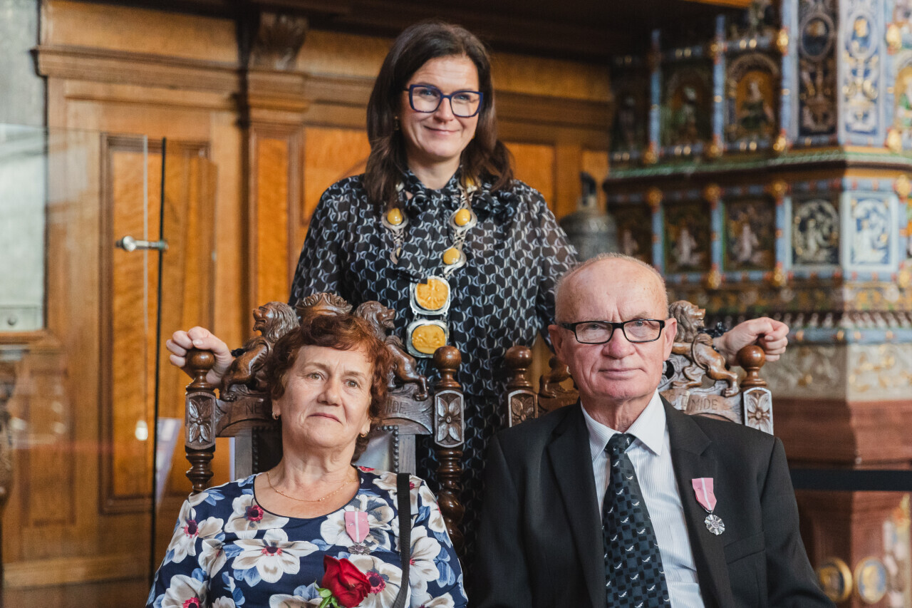 Gdańsk. Dwór Artusa. Jubileusz Par Małżeńskich - Złote Gody, podczas których Prezydent Gdańska Aleksandra Dulkiewicz wręczyła medale za długoletnie pożycie małżeńskie