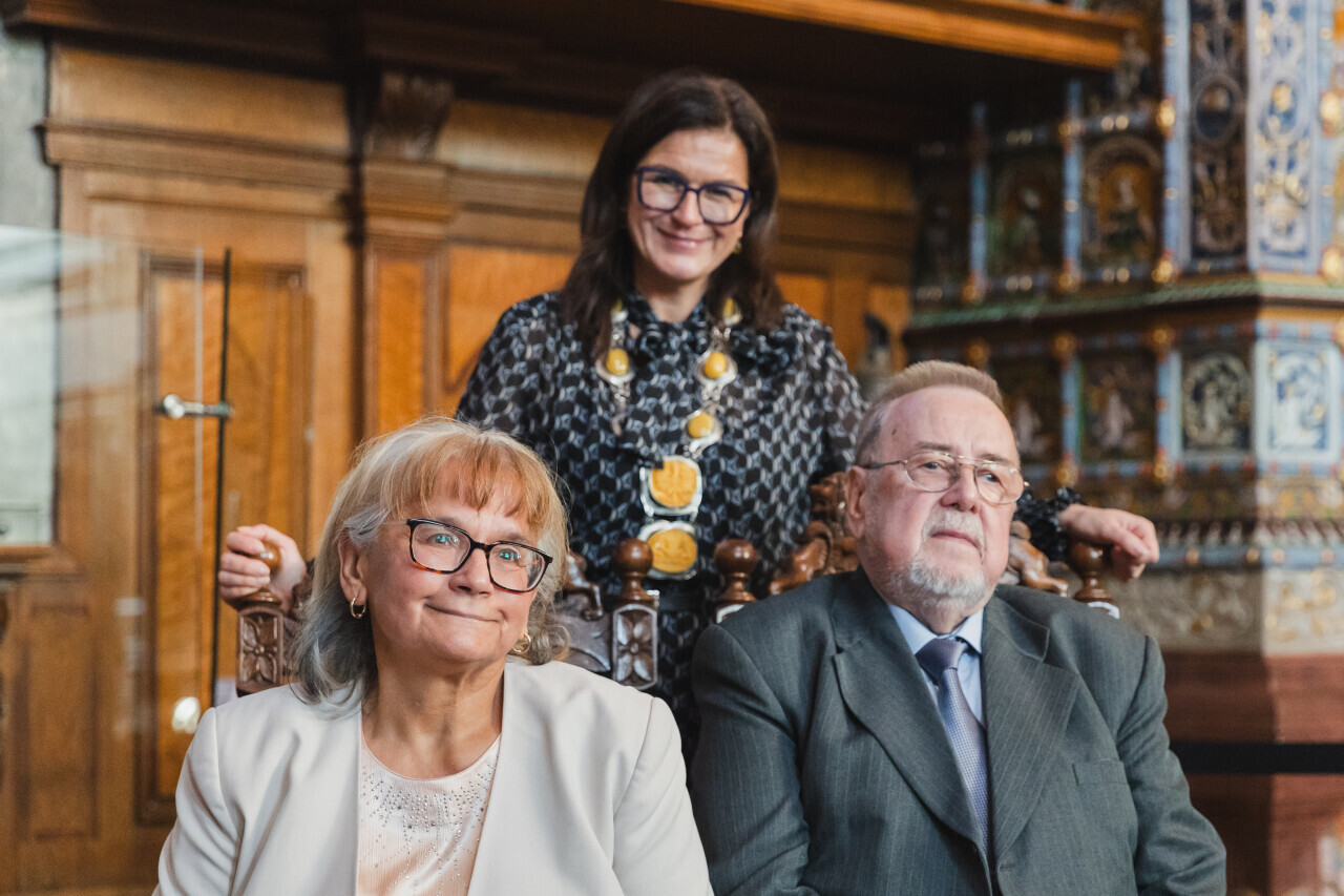 Gdańsk. Dwór Artusa. Jubileusz Par Małżeńskich - Złote Gody, podczas których Prezydent Gdańska Aleksandra Dulkiewicz wręczyła medale za długoletnie pożycie małżeńskie