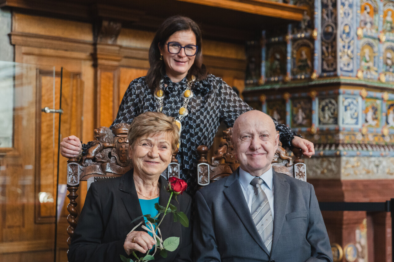Gdańsk. Dwór Artusa. Jubileusz Par Małżeńskich - Złote Gody, podczas których Prezydent Gdańska Aleksandra Dulkiewicz wręczyła medale za długoletnie pożycie małżeńskie