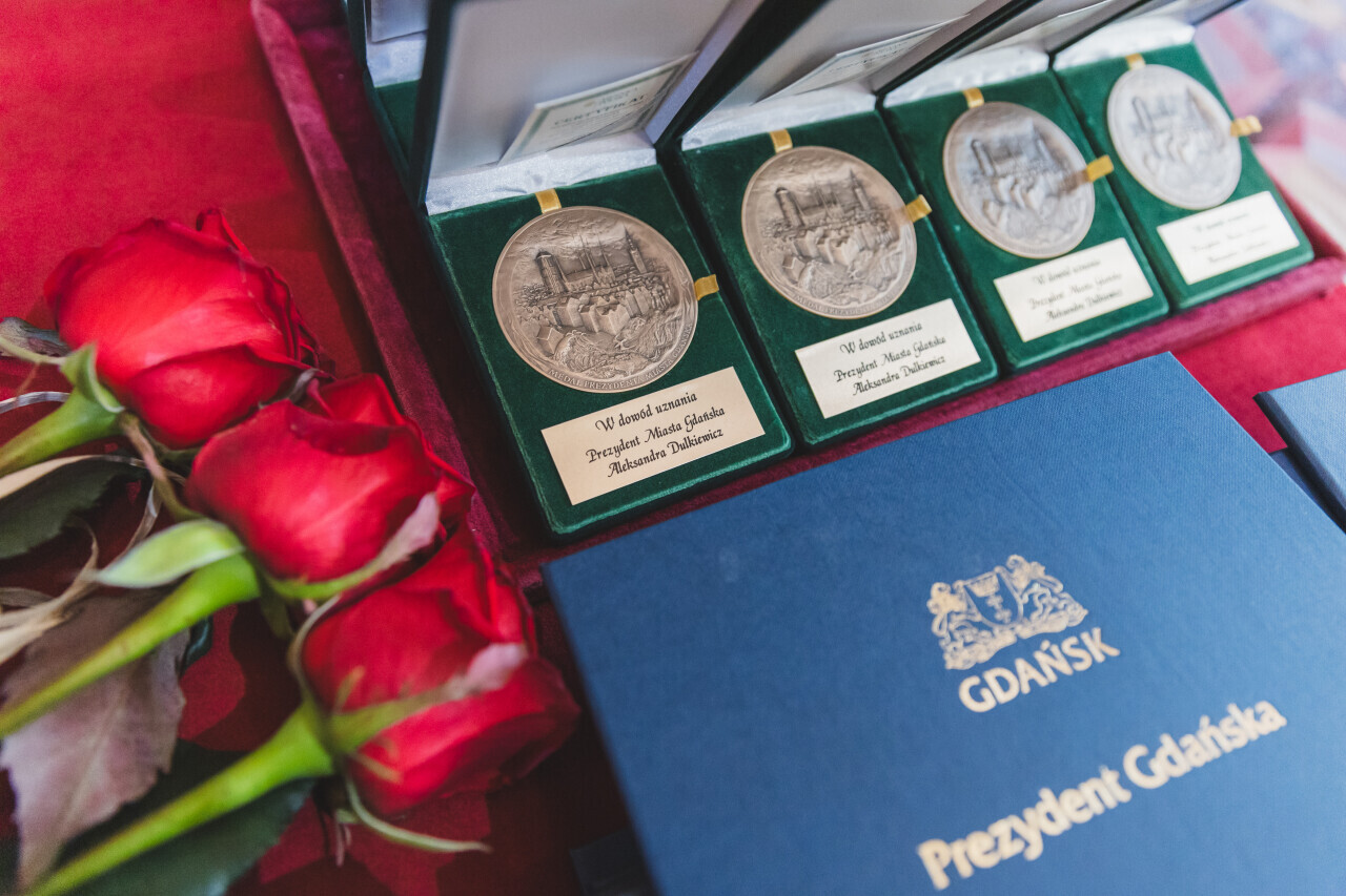 Gdańsk. Dwór Artusa. Jubileusz Par Małżeńskich - Złote Gody, podczas których Prezydent Gdańska Aleksandra Dulkiewicz wręczyła medale za długoletnie pożycie małżeńskie