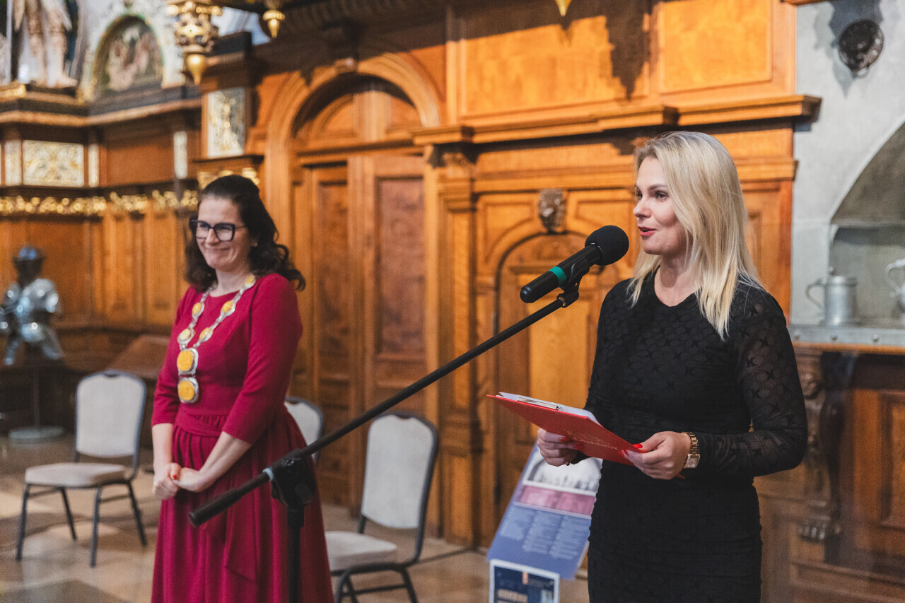 Gdańsk. Dwór Artusa. Jubileusz Par Małżeńskich - Złote Gody, podczas których Prezydent Gdańska Aleksandra Dulkiewicz wręczyła medale za długoletnie pożycie małżeńskie