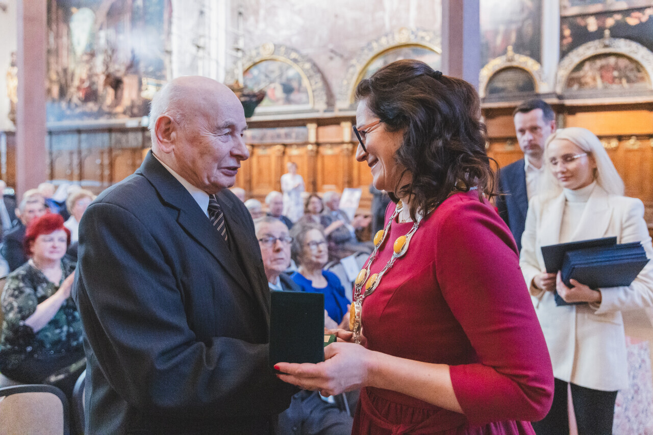 Gdańsk. Dwór Artusa. Jubileusz Par Małżeńskich - Złote Gody, podczas których Prezydent Gdańska Aleksandra Dulkiewicz wręczyła medale za długoletnie pożycie małżeńskie