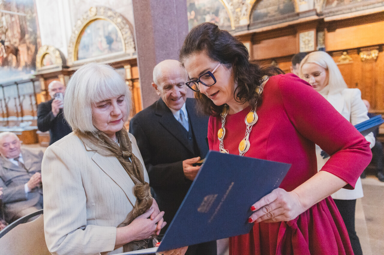 Gdańsk. Dwór Artusa. Jubileusz Par Małżeńskich - Złote Gody, podczas których Prezydent Gdańska Aleksandra Dulkiewicz wręczyła medale za długoletnie pożycie małżeńskie
