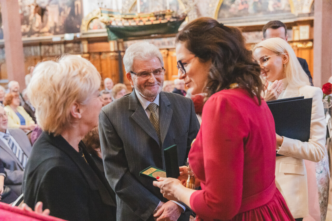 Gdańsk. Dwór Artusa. Jubileusz Par Małżeńskich - Złote Gody, podczas których Prezydent Gdańska Aleksandra Dulkiewicz wręczyła medale za długoletnie pożycie małżeńskie