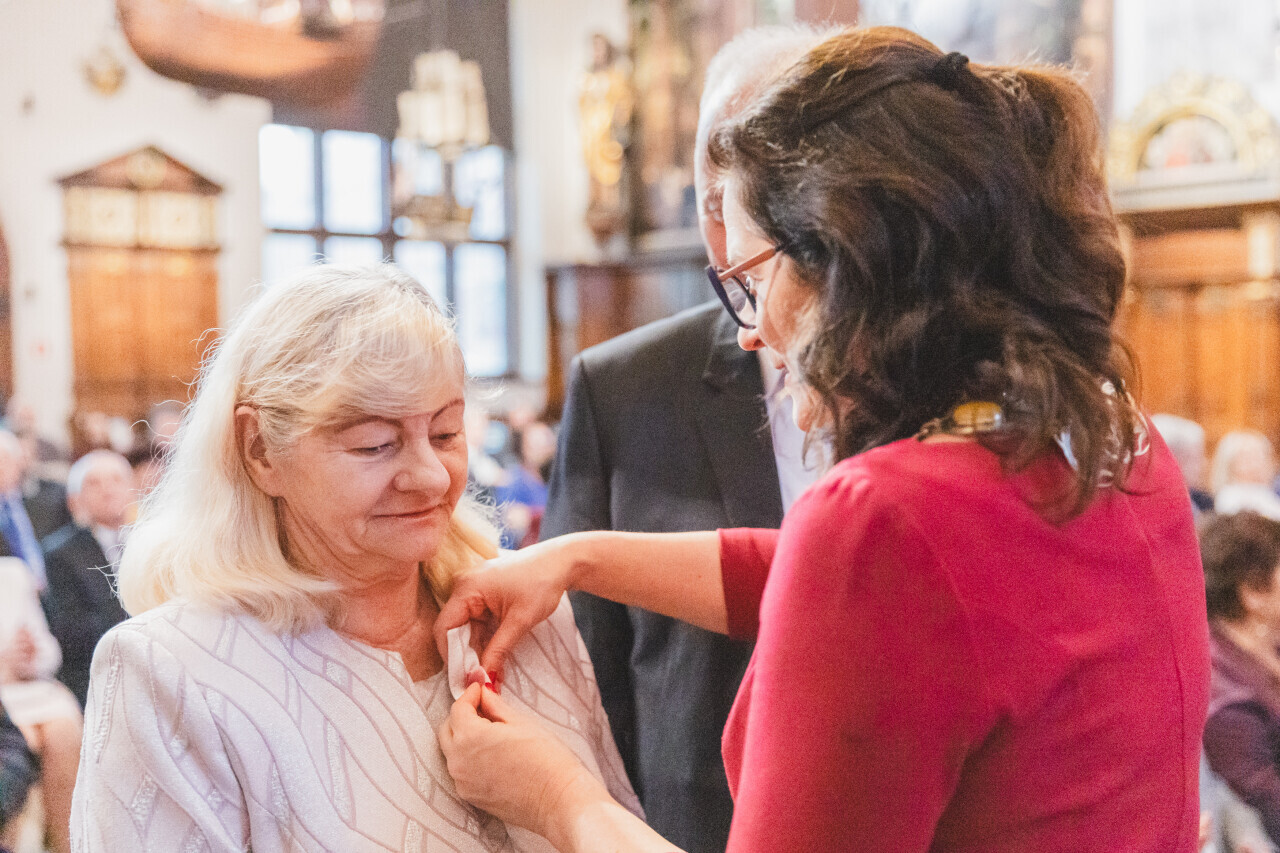 Gdańsk. Dwór Artusa. Jubileusz Par Małżeńskich - Złote Gody, podczas których Prezydent Gdańska Aleksandra Dulkiewicz wręczyła medale za długoletnie pożycie małżeńskie